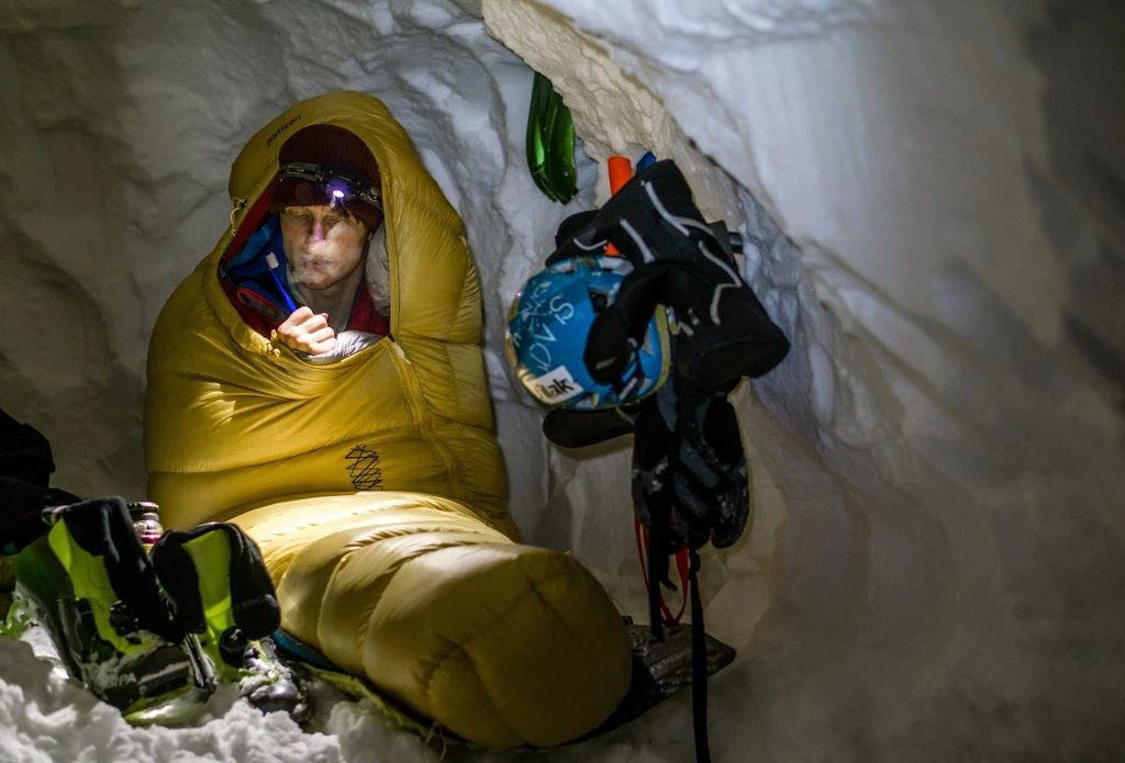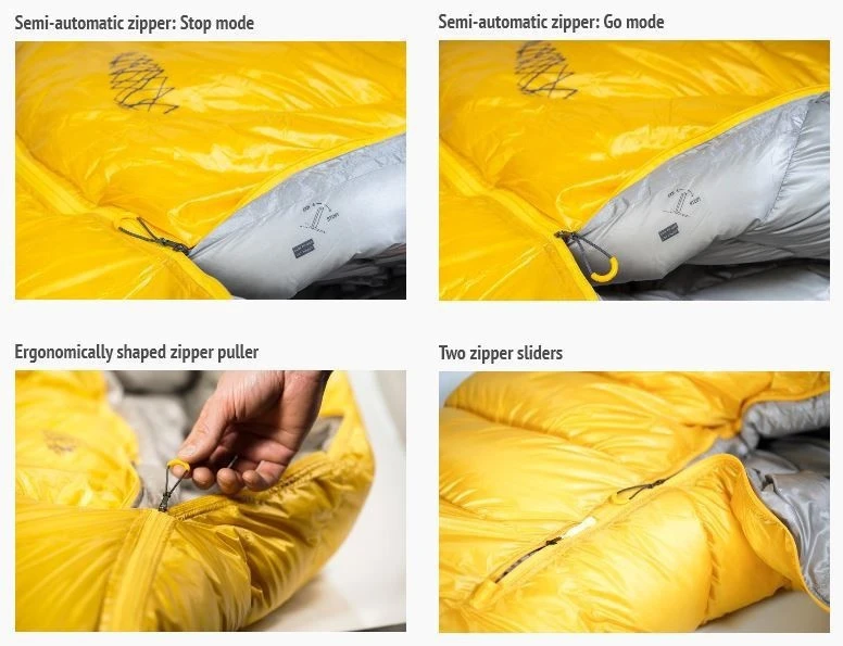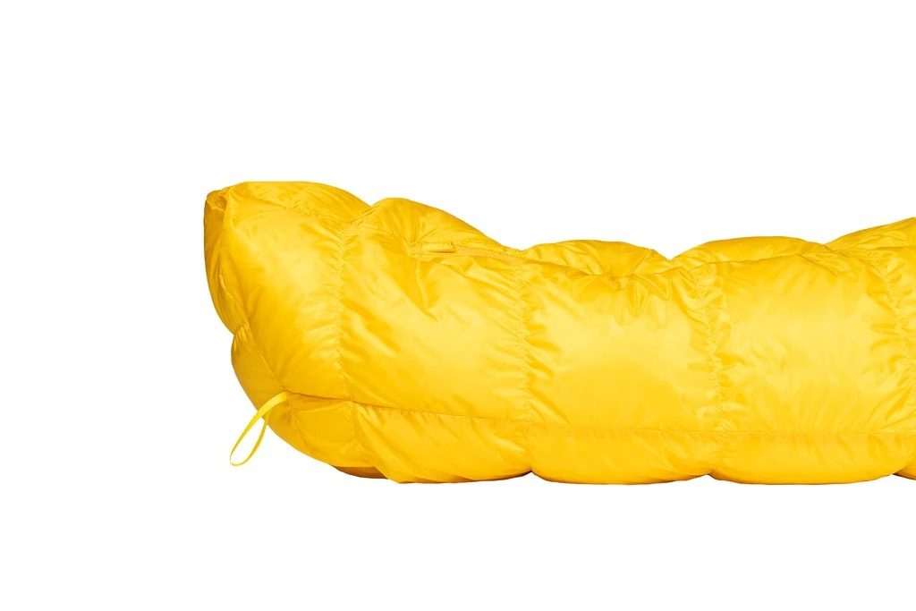 L’enveloppe du sac de couchage G400 est un tissu en Pertex Quantum Ripstop traité DWR contre l’humidité. La fermeture éclair semi-automatique de 3 millimètres remonte sur le dessus. Cela permet de l’atteindre plus facilement, notamment la nuit dans le noir, mais surtout, d’obtenir une construction plus anatomique au niveau des épaules, ne nécessitant pas de velcro pour fermer l’ouverture. Muni d’un bloqueur, une fois celui-ci enclenché, le curseur de la fermeture eclair ne coulisse plus. Sur le pourtour du visage, l’isolation est assurée en fibre synthétique Climashield. Celle-ci est plus adaptée à l’humidité expirée durant la nuit, et elle ajoute un confort supplémentaire au niveau du cordon de la capuche.