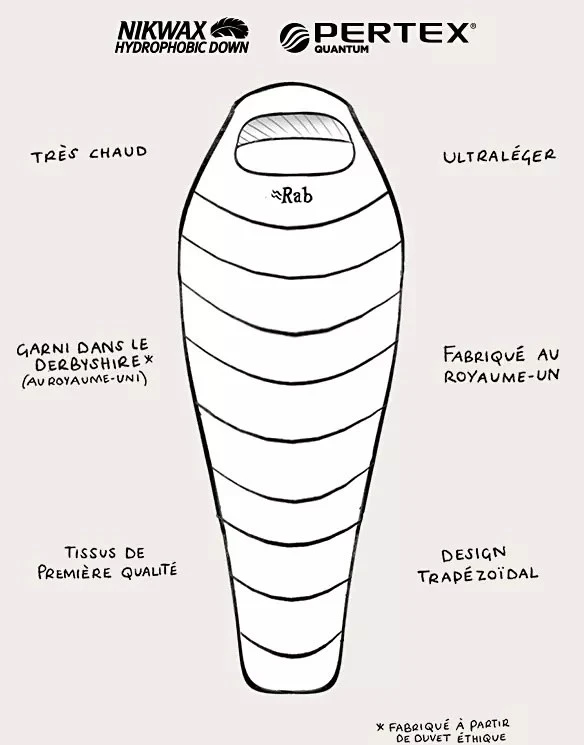 Les cloisons en forme de trapèze limitent au maximum les déperditions. Ses compartiments en croissant vers le bas permettent de maintenir le duvet au centre du corps et de garantir un bon niveau de chaleur. Sa forme momie et son espace angulaire pour les pieds le rendent très spacieux pour son poids.