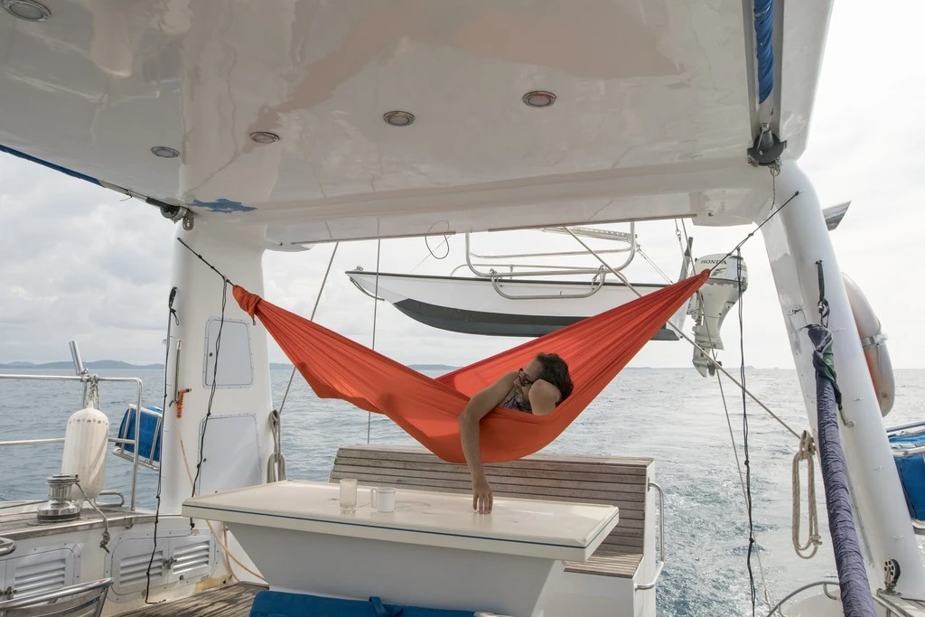 Le Hamac Compact de chez Ticket to the Moon est fabriqué en toile de parachute : 100% nylon. Ce tissu est confortable, respirant, doux et très élastique. Ce hamac épouse parfaitement la forme du corps : une fois installé, on ne ressent aucun point de pression. Ce hamac est simple et rapide à accrocher grâce à ses systèmes d’accroche (vendu séparément) et car il est doté de crochets en inox très résistants (inclus).