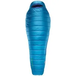 Ce sac de couchage est garni en duvet d’oie grise fermière de 800 cuin + avec une répartition de garnissage 95/5. Il est pourvu de 32 compartiments pré-coupés de forme tubulaires qui représentent 80 pièces de tissu assemblées dans une construction 3D.